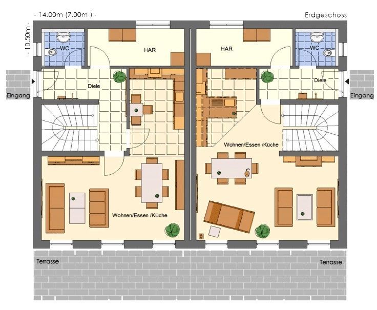 Die Wohnfläche beträgt je Doppelhaus ca. 103 m2 und ist aufgeteilt im Erdgeschoss in Wohn- und Essbereich, offener Küche, Hauswirtschaftsraum, Diele und Gäste-WC, sowie eine große Terrasse.