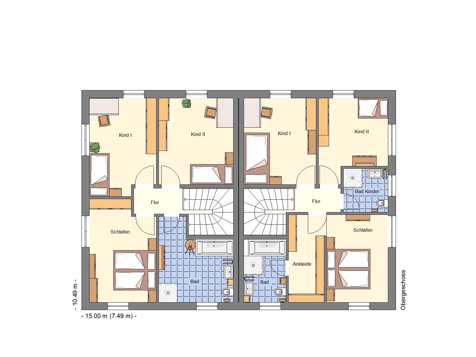 Im Obergeschoss sind zwei Kinderzimmer und ein oder zwei Bäder geplant. Das Elternschlafzimmer ist mit und ohne Ankleide planbar. Auf Wunsch kann ein Keller eingeplant werden.